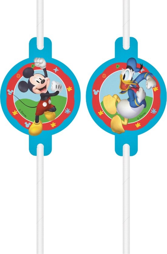 4 stevige papieren FSC Mickey Mouse rietjes met kartonnen versiering van Mickey Mouse en Donald Duck. Elke beker limonade wordt pas écht feestelijk met een Disneyrietje!
