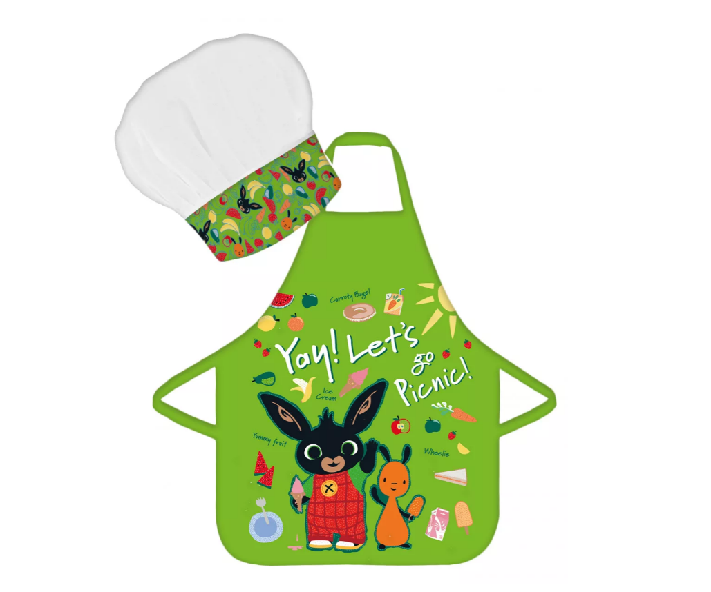 Het keukensetje bestaat uit een keukenschort en een koksmuts en heeft een afbeelding met Bing en Flop.