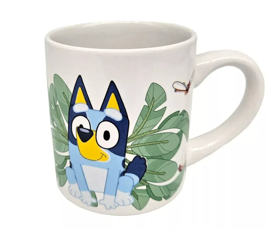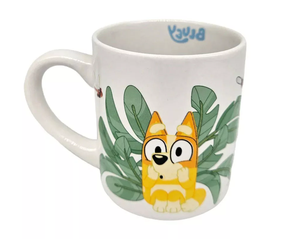 Keramiek Bluey mok met rondom een afbeelding van Bluey en Bingo.