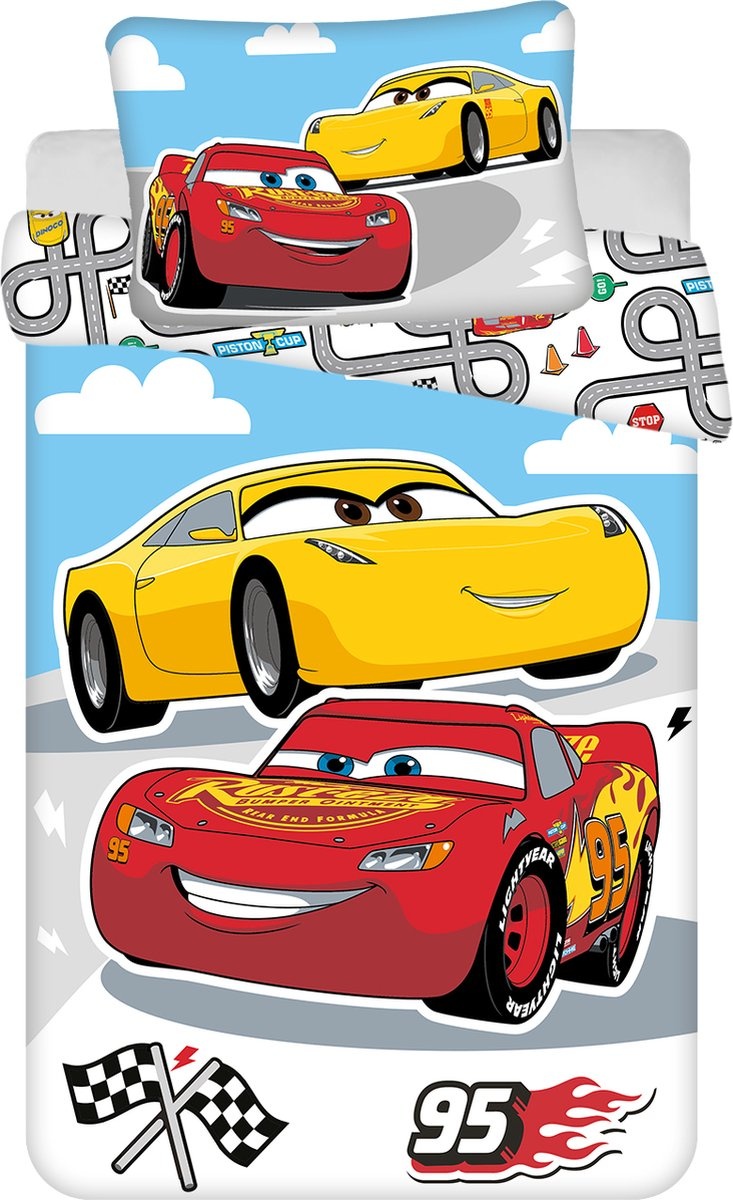 De Disneydekbedhoes is dubbelzijdig te gebruiken en zorgt ervoor dat je kleine schat met een glimlach in slaap valt. Met een print van Lightning McQueen en Cruz Ramirez.