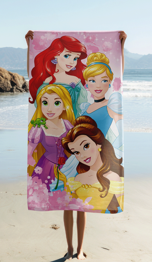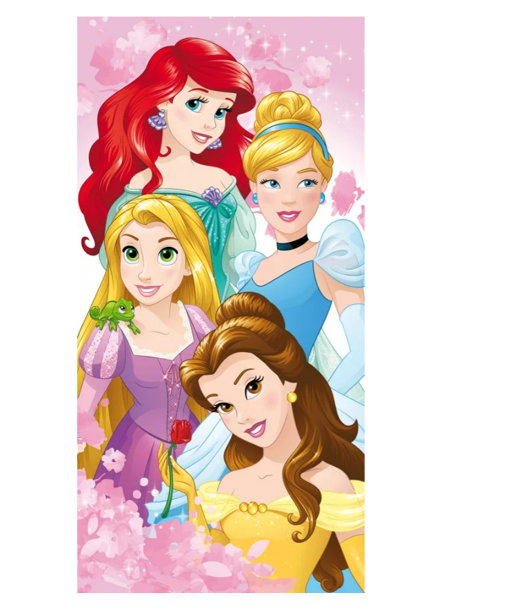 Heerlijk Disney Princess badlaken met Rapunzel, Belle, Assepoester en Ariël, de kleine zeemeermin. Deze grote Disneyhanddoek is ideaal voor thuisgebruik, voor bij de zwemles of om als strandlaken te gebruiken om te luieren op het strand.