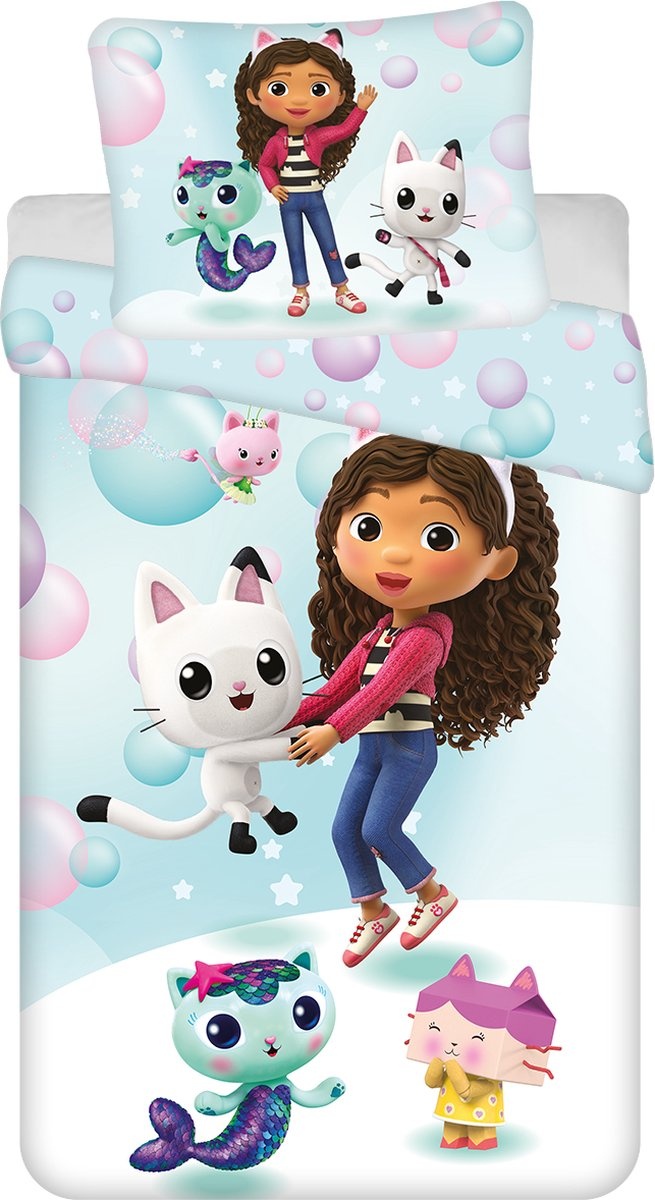 Deze Gabby's Dollhouse dekbedhoes is dubbelzijdig te gebruiken en heeft een print met Gabby, BabyBox kat, Meerminkat, Pandy Poek en Kitty Fee.