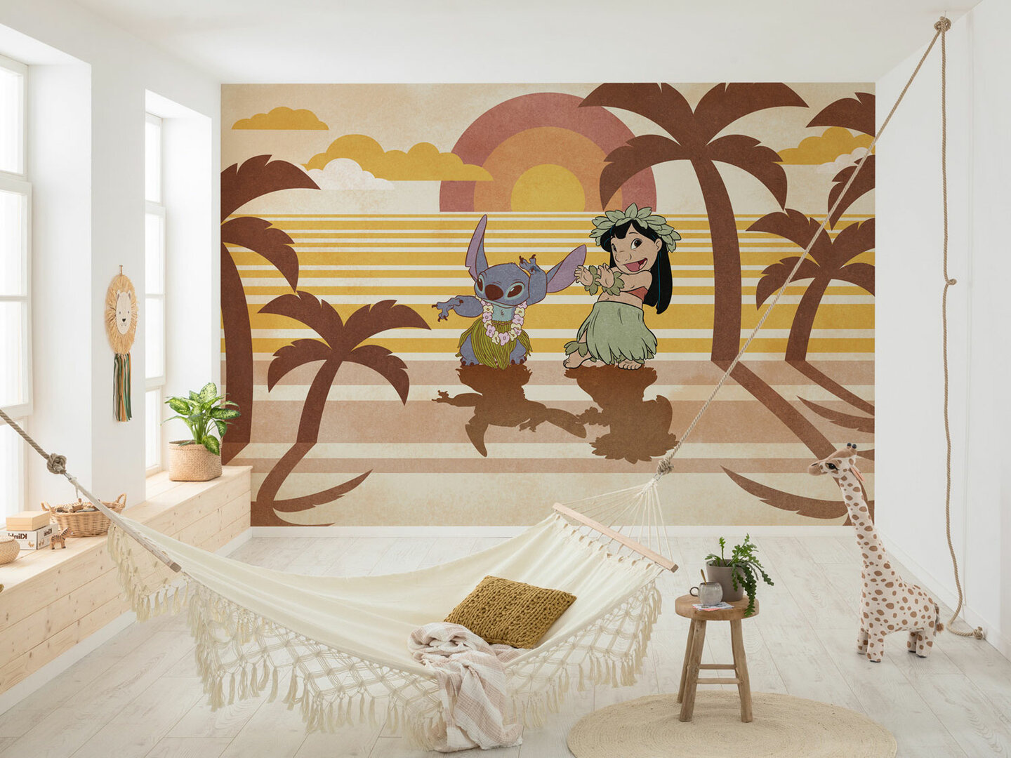 Op dit vlies fotobehang zijn Lilo en Stitch te zien die de Hula dansen tijdens de zonsondergang. De warme gele, bruine en beige tinten zorgen voor een ontspannen, nostalgische sfeer in de kamer met een vleugje vintage charme. De grafische palmen en het zacht overlopen van de kleuren versterken het tropische vakantiegevoel.