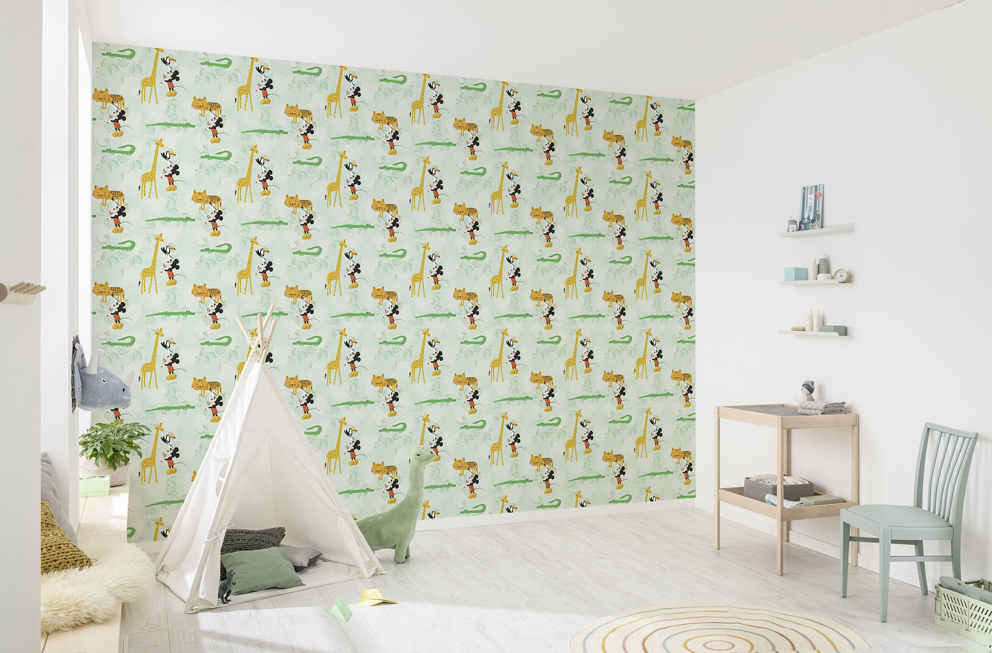 Op dit Mickey Mouse Zoo behang zie je Mickey Mouse met krokodillen, giraffen en tijgers. Ideaal voor het creëren van een speelse dierentuin of junglekamer met de magische uitstraling van Disney.