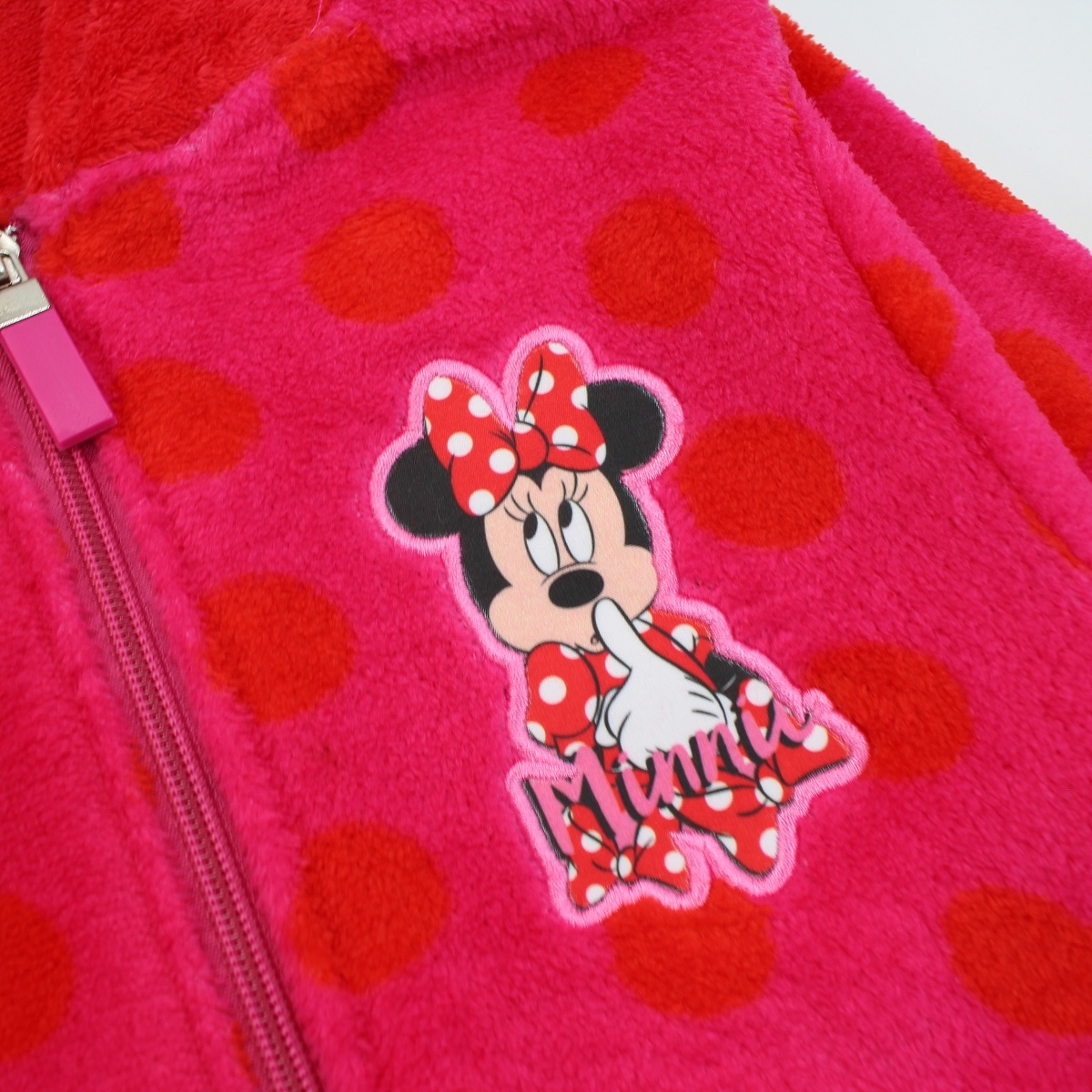 Deze fleece ochtendjas heeft 1 zak op het voorpand, een lange rits en op borsthoogte zit een applicaties van Minnie Mouse.