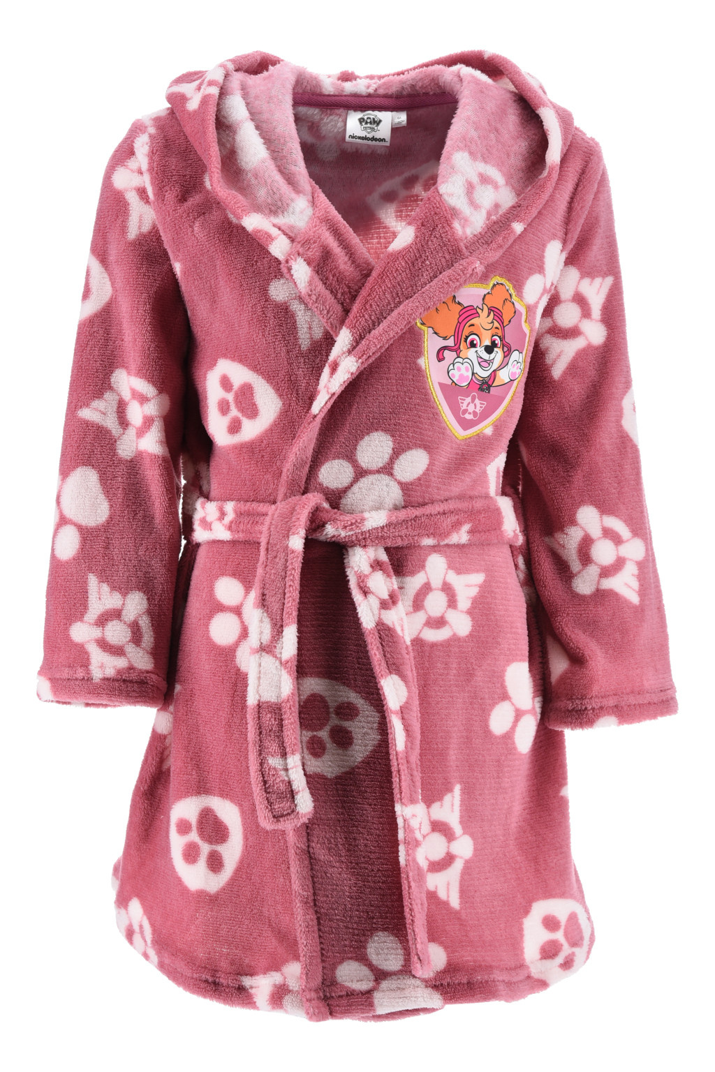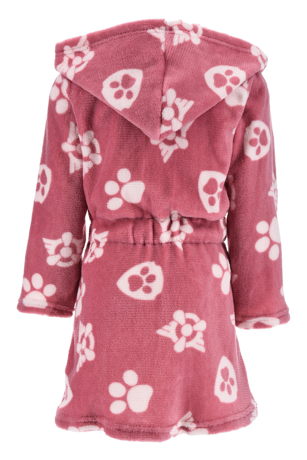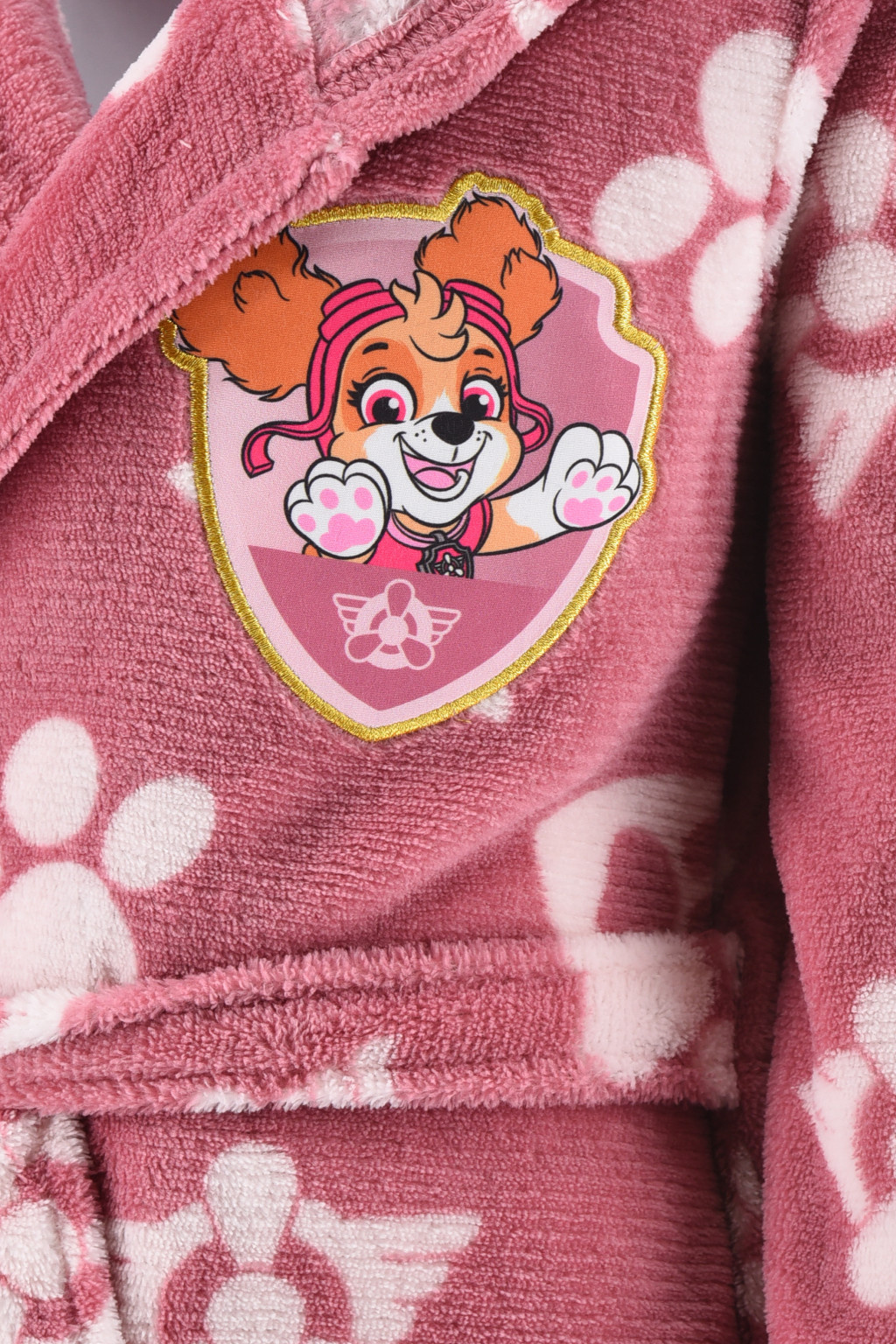 Deze fleece ochtendjas heeft een all-over print van pootjes en een applicatie met Skye.