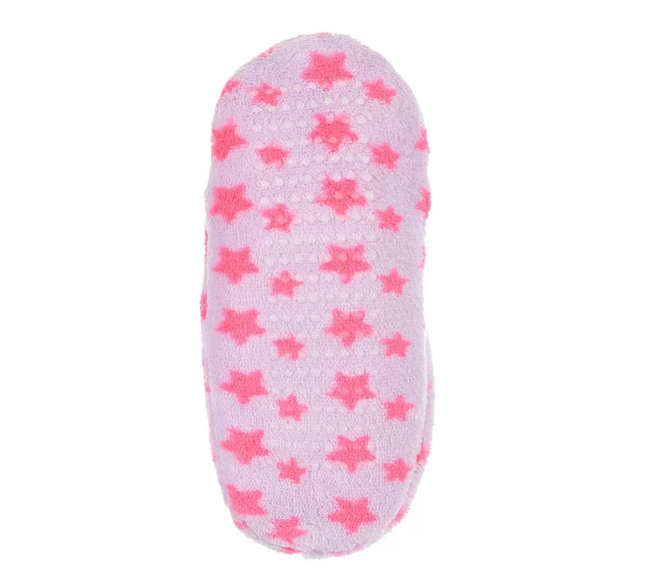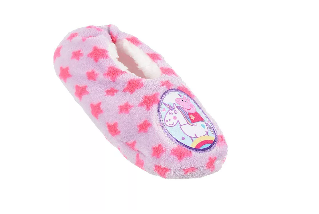 De roze pantoffel slofjes hebben een applicatie met Peppa en Suzy Schaap en de lila uitvoering heeft roze sterretjes en een applicatie van Peppa Pig op een unicorn.