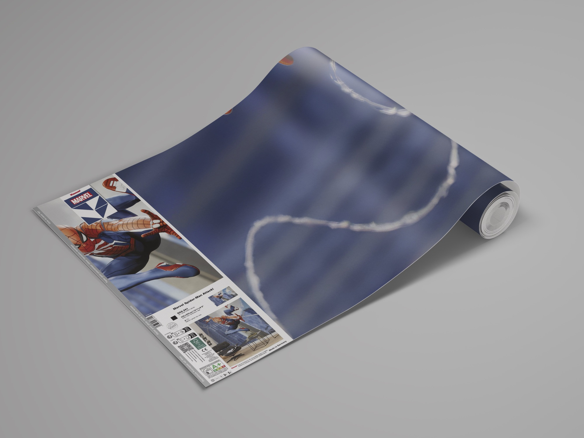 Op dit Marvel vlies behang zie je Spiderman slingerend tussen imposante wolkenkrabbers. Het Marvel behang straalt pure energie uit,