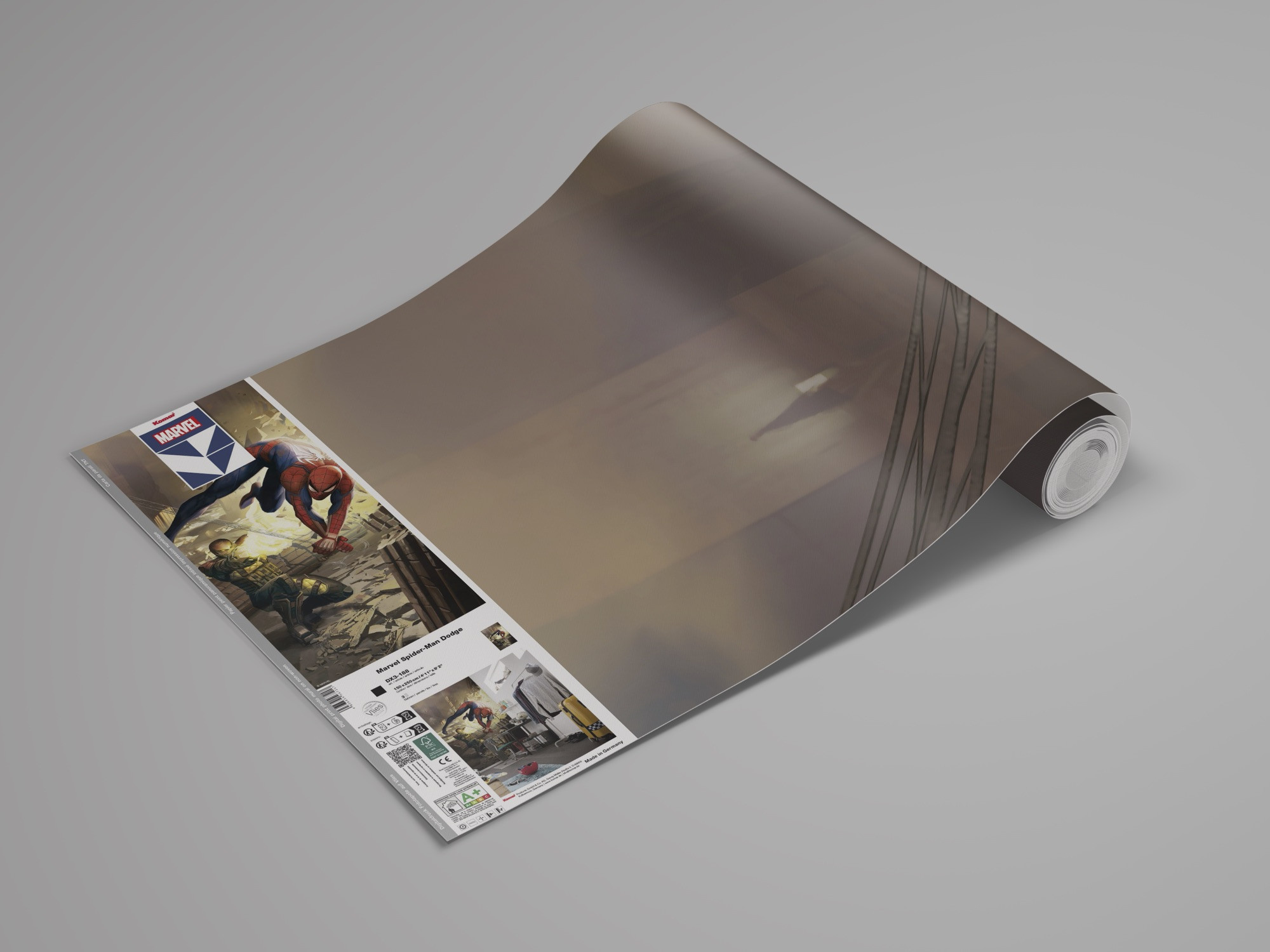 Op dit Spiderman fotobehang "Dodge" slingert de populaire Marvel superheld zich door een verwoeste omgeving om een dreigende vijand te ontwijken. De scene oogt dramatisch en vol beweging.