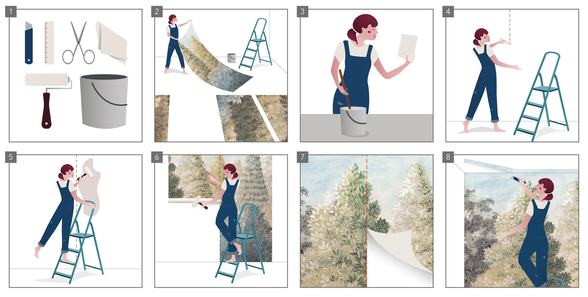 Bij het plakken van de eerste baan is het van groot belang dat deze goed waterpas wordt aangebracht om het patroon mooi door te laten lopen.