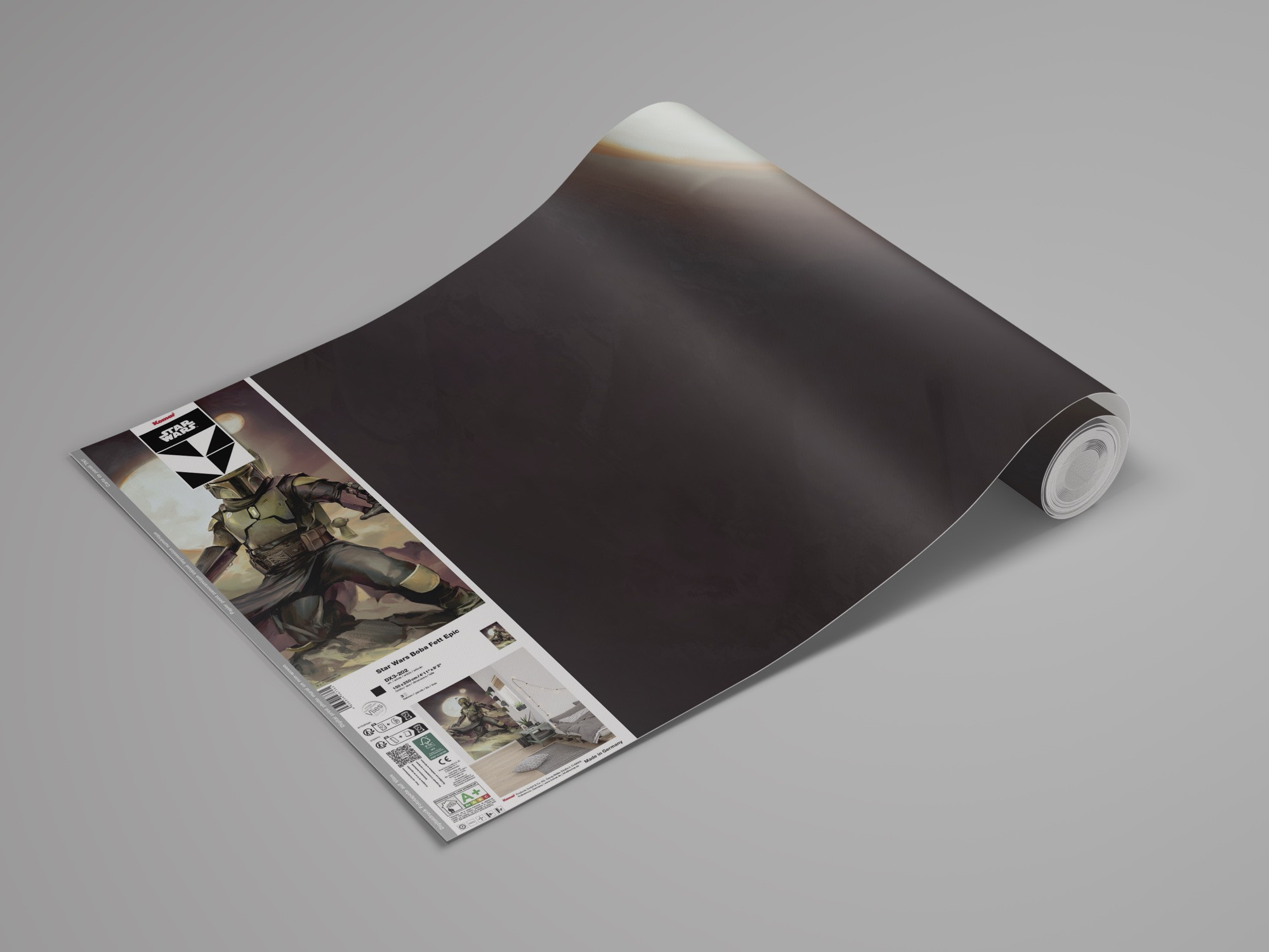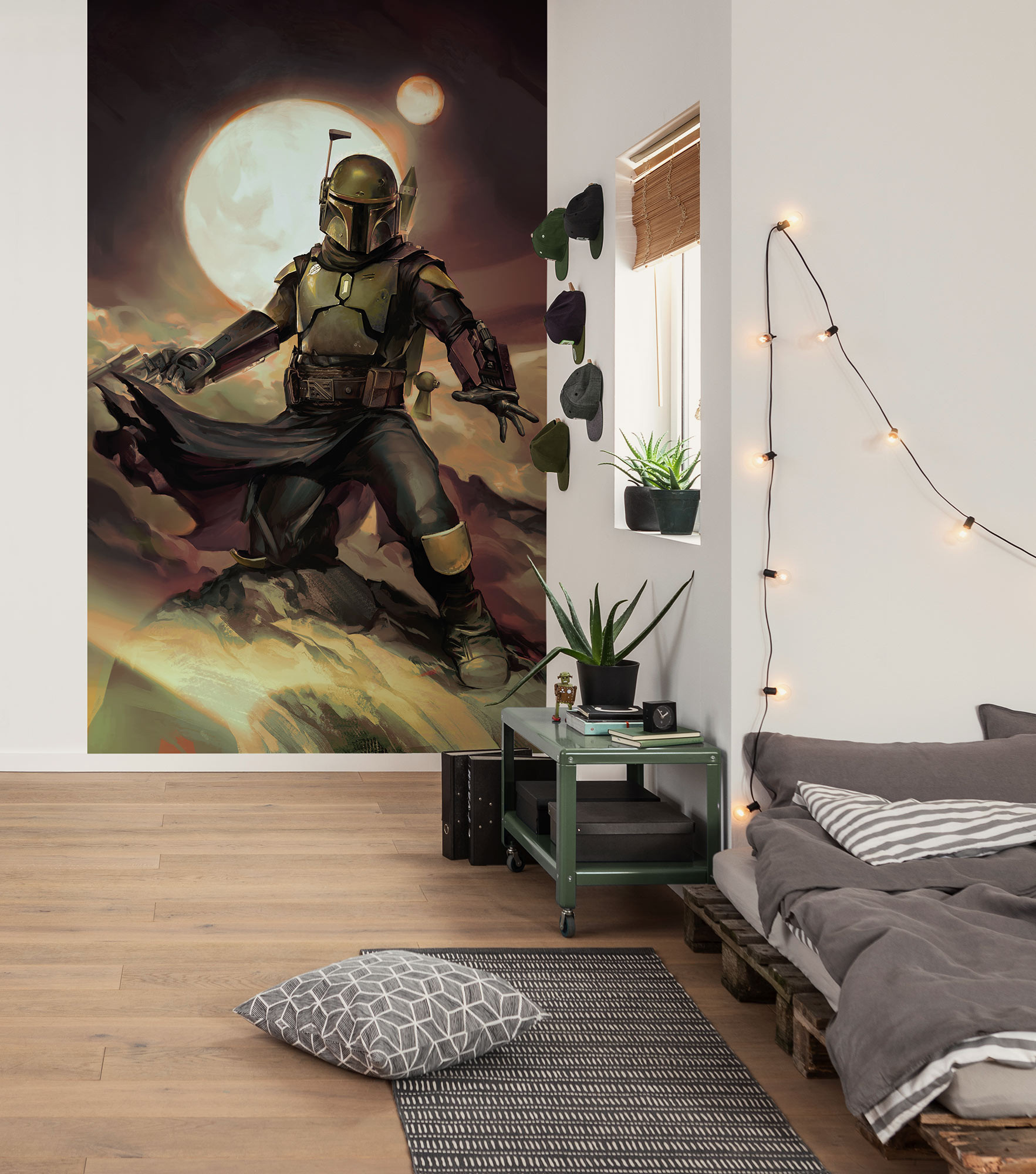 Boba Fett wordt op indrukwekkende wijze in al zijn glorie weergegeven op dit Star Wars fotobehang. Het dynamische samenspel van licht en aardse kleuren geeft de kamer een krachtige energie. Fans van alle leeftijden zullen zich direct thuis voelen bij de levendige uitstraling van de superheld.
