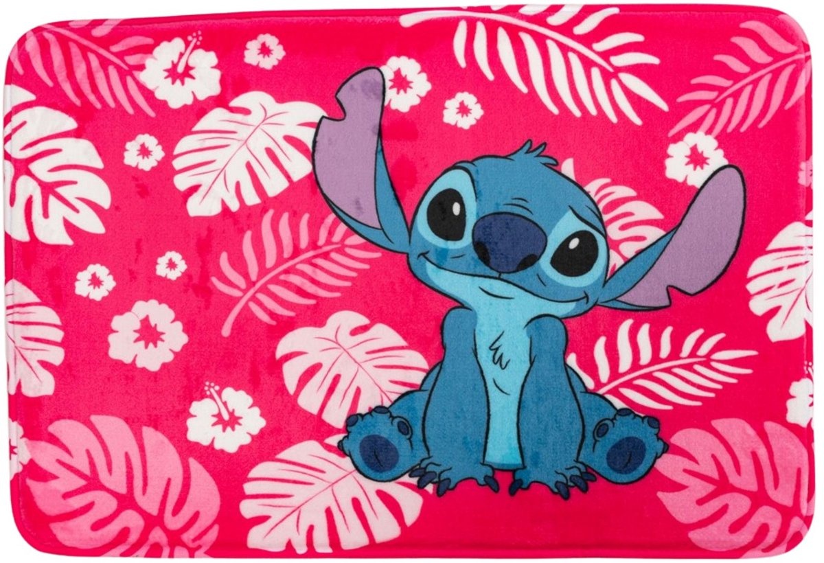 Een vrolijke roze achtergrond vol tropische bladeren en bloemen, met in het midden de ondeugende Stitch. De onderkant is antislip en zorgt ervoor dat de mat stevig blijft liggen, terwijl de zachte foam laag heerlijk aanvoelt onder je voeten.
