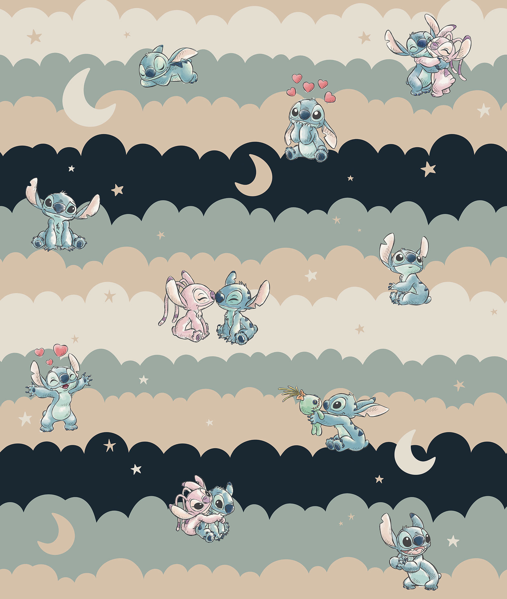 Dit Stitch en Angel vinyl behang toveren een glimlach op kleine gezichtjes en veranderen elke kamer in een gezellige knuffelzone met een gegarandeerde dosis geluk. Tussen zachte wolken en een slaperige maan zie je Stitch en Angel.