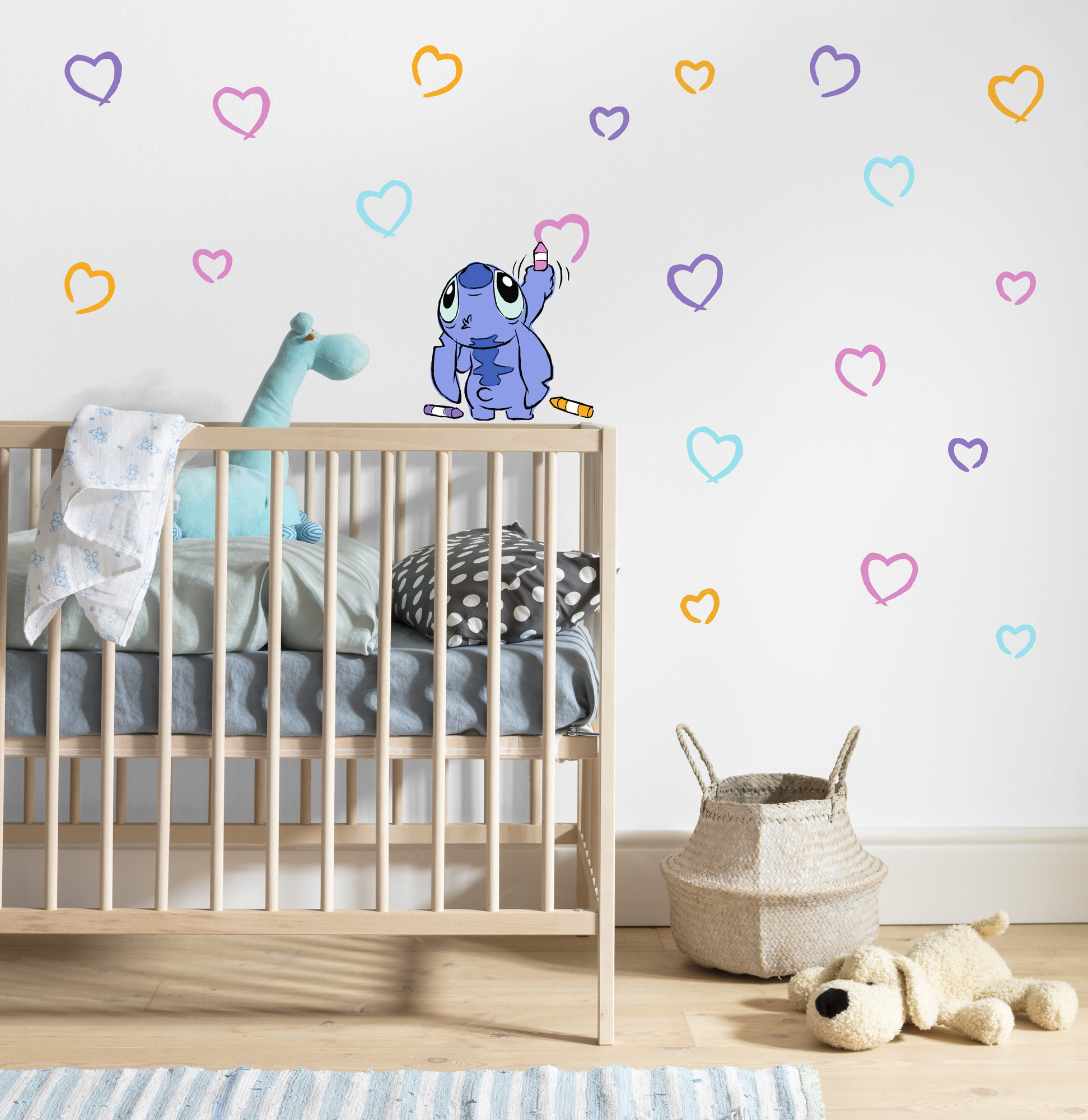 Deze Stitch muurstickers worden op 1 groot vel geleverd met daarop 22stickers om zelf een compositie samen te stellen. Stitch schildert vol enthousiasme en liefde vele hartjes op de muur en brengt zo de Disney magie tot leven.
