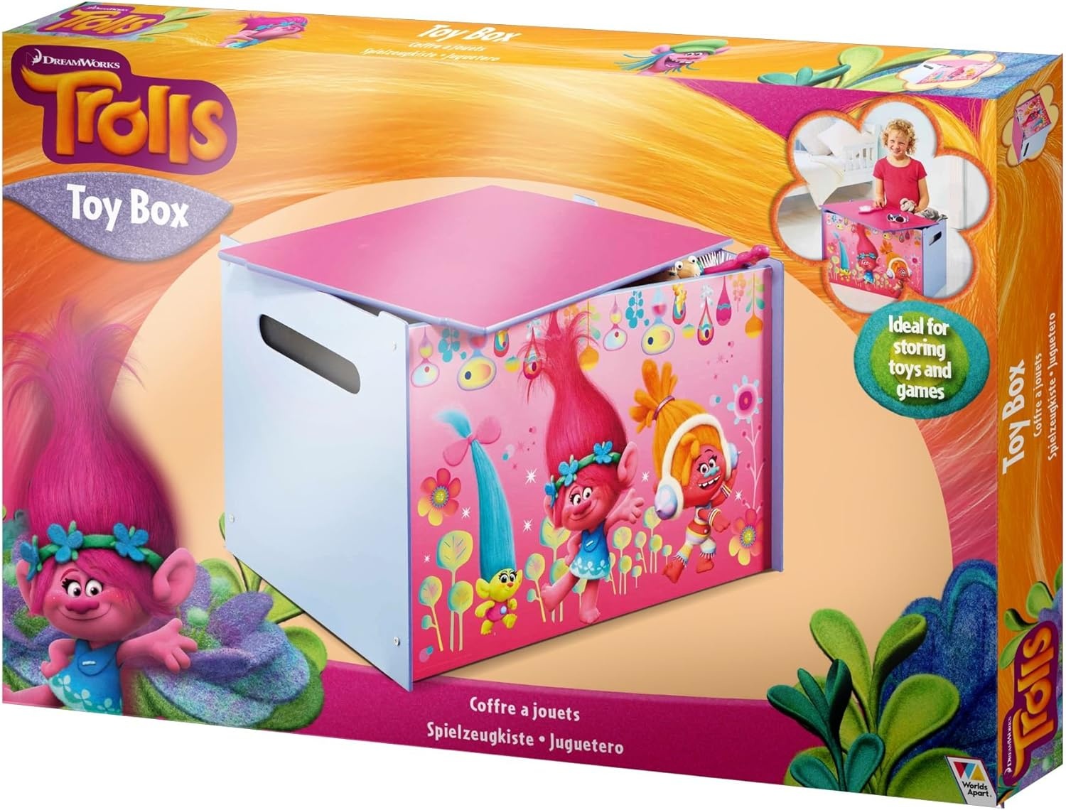 Deze stevige Trolls speelgoedkist is gewoon perfect voor het opbergen van al het favoriete speelgoed en spelletjes. Ideaal voor zowel de slaapkamer als de speelkamer. Gemaakt van stevig MDF, is deze leuke speelgoedkist zo in elkaar gezet met behulp van het snelle en eenvoudig t-bevestiging-systeem. Bedrukt met de hoogste kwaliteit Trolls graphics is dit praktische kwaliteitsmeubel echte must have voor de kleintjes.